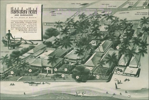 Previous Image Next Image 17-640×431-1 The Halekulani Hotel began in 1883. On this diagrem, bldg. 4 is the site of the original structure and the main building of the complex. Of course, it has been renovated many times but the rich history of the site has been preserved.