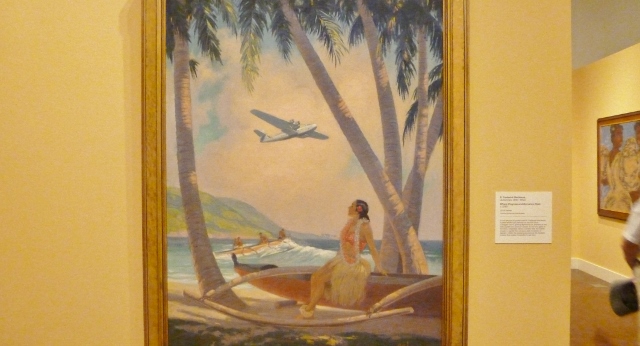 But in the 1930s, the traditions and customs of ithe islands were coming to grips with the effects of progress. The Art Deco Exhibit at the Honolulu Museum of Art examplified the move. This is R. Frederick Herckman’s “Where Progress and Romance Meet.”