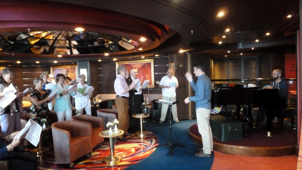 Previous Image Next Image 20 (1024×576) Ship’s musicians lead passengers in choral singing. In addition, there will be a pasenger talent show in the lounge tomorrow.