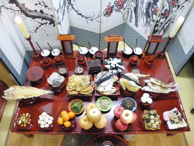 A South Korean table set for Chuseok Day dinner. (Namwon030, CC BY-SA 3.0 , via Wikimedia Commons)