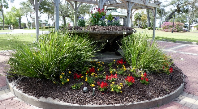 A Downtown Panama City park with an intricate wooden carving on display (visible on the left).