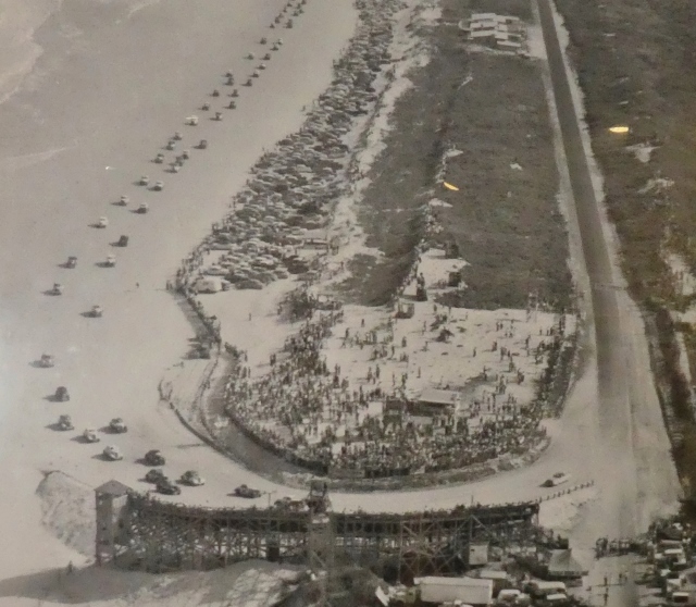 By 1936, the races were taking place all up and down the beaches. To the south, at Ponce Inlet, the beaches were hosting races on the newly created oval track. This track, called the Daytona Beach and Road Course, started on the beach at Ponce Inlet; went north on the hard-packed sand paralleling the ocean; turned left through the banked-sand North Turn and headed west back to A1A; at that point, turning south on two-lane, paved Atlantic Ave (A1A) back to the start/finish line. Today, the “Racing’s North Turn Restaurant” still serves racing fans as they overlook that famous north turn.