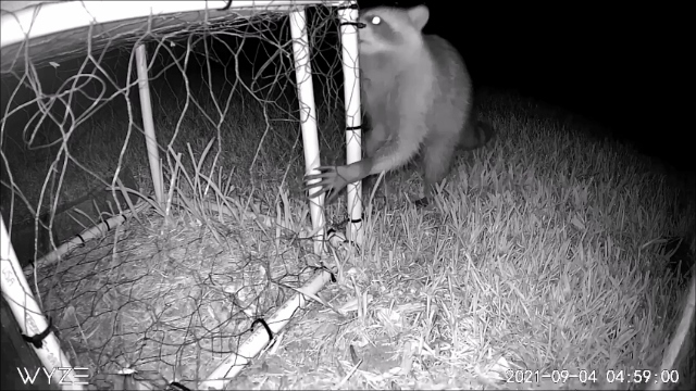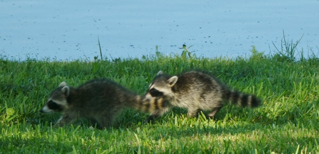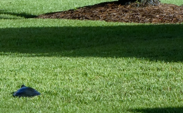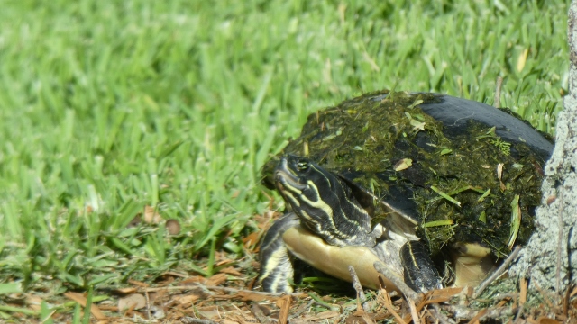 These are Florida Cooters.. They are fresh water turtles and live in lakes, ponds and rivers throughout the state. We often see them sunning along the lakeshore–usually in the late afternoon.We don’t often see them wandering across the grass.However, when it’s time to build a nest, the female turtle becomes quite determined!!! She will make a mighty effort to find the perfect nesting location.And at the end of June, we were surprised and delighted to see a Mama Cooter come ashore and build her nest under the live oak.She used her rear flippers to dig a hole. The depth of the hole (and therefore the depth of the eggs) will be determined by the turtle’s size–the larger the turtle; the deeper the nest.It takes quite a biat of time to build the nest and Mama is persistent in her digging.Unfortunately, she attracts an audience. Note the squirrel watching intently from the shadows at the left.She’s also seen by a couple of young racoons. Racoons love turtle eggs!!!So do crows. While Mama Turtle toiled with the nest-building, the crows flew unto the tree branches and bided their time waiting for her to finish. No doubt anticipating an enjoyable meal!!!Once the eggs are deposited, Mama’s job in done.She turns her back on the nest and will not return.She does not tend nor watch over the nest. She simply returns to the lake.Her job is done; her responsibility is over. The eggs are left to fate.And to us!!! We immediatelly rushed out to secure the nesting area from the threatening predators!!!We covered the nest and headed to the hardware store for materials to create a fortress!!!We secured the area!!!And added caution tape to keep the landscapers away from the nest for the next 3 months while gestation took place. We also added a camera to watch the process.And that’s how we saw the racoon trying to get into the nest!!!And the squirrel!!! We also saw possums and an armadillo come by to inspect the area!!!Oh Happy Day!!!! On September 30th–three months after Mama Turtle created the nest– the first baby Cooter was spotted!!!It usually take 2 or 3 months for the eggs to hatch. We anticipated seeing hatchlings around the end of August. But temperature and rain affect the timing. Our little guy didn’t make an appearance until September 30th!!!Isn’t he just the cutest!!!We scooped him up and took him to the lakeshore where he promptly Jumped in and swam to the depths!!!Now he’s on his own!!!! We hope he finds his family and the other Cooters. We like to think he’ll survive the daunting predators and grow to enjoy a long and sun-filled life!!!But he’ll have to elude the otters!!!