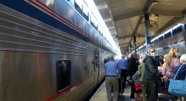 Ahh, but first, here’s a little info on the creation of Amtrak. Founded in 1971, the National Railroad Passenger Corporation, doing business as Amtrak, is a for-profit organization owned by the United States government and managed by the U.S. Department of Transportation. Their business is providing rail passengers long-distance inter-city service to more than 500 destinations in 46 states and 3 Canadian provinces with more than 300 trains daily over 21,400 miles of track. Amtrak owns only 623 miles of that track. Say what???!!! Just how does that work? Well, passenger trains were once owned and operated by private corporations whose primary business was transporting freight. They got into passenger service as a sideline. Demand grew; and by 1916 they were serving 42 million passengers a year. But with the advent of cars and buses and air travel, ridership declined. By 1967 there were only 6 passenger trains in service. The U.S. government came to the rescue by passing the Rail Passenger Service Act. Amtrak was up and running in 1971 with equipment and tracks LEASED from the freight lines!!! Today, the cars are owned by Amtrak, but the tracks are still leased. And that’s what causes many of Amtrak’s problems. All too often, the freight takes precedence on the tracks while passengers are shunted to a siding and wait, and wait, and wait. Amtrak is seldom on time!!!
