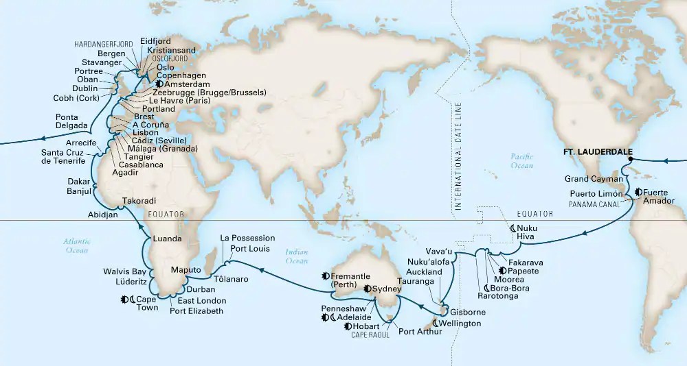 Your RovingRaconteurs will begin a series of cruises that will span the world! We will begin by celebrating the New Year in the Caribbean. Then, after transiting the Panama Canal, we will visit French Polynesia, New Zealand, and Australia, continuing to Mauritius, Reunion, Madagascar, and Mozambique. Our African exploration will be extensive, traveling up the western coast as we make our way to Europe—Spain, France, Belgium, on to Denmark, The Netherlands, and Norway; continuing to Scotland, Ireland, and the UK; visiting the Azores and returning to the Bahamas before disembarking in Ft. Lauderdale in the middle of May. We will spend 133 days aboard Holland America’s MS Zuiderdam!!!