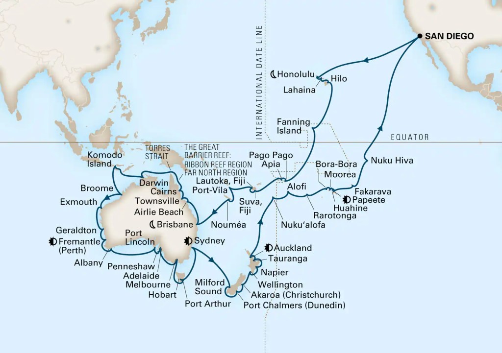 As 2023 closes, we will fly to San Diego. 2024 will begin aboard Holland America’s MS Volendam with a 94-day Grand Australia & New Zealand Voyage.