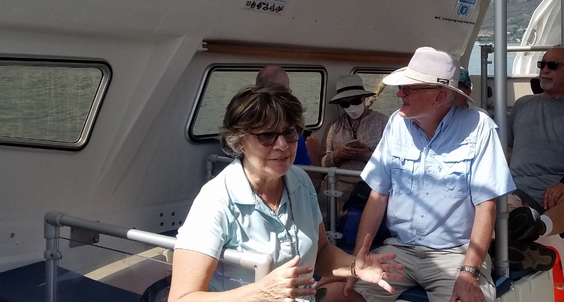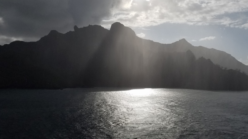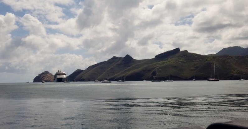 Well, we reached the museum only to discovered the restaurant we remembered was closed and under renovation. The workers told us Rose was ill and the museum closed. Turns out that was not quite correct. We don’t know about Rose’s health; but the museum was open. We did not learn that until later. So we admired the view of the ship and chose to return to it!!!!So, having just experienced our 4th bad of the day; and being hot and tired after a 1 1/2 mile walk, we thought of calling for a cab. No cab to be had. Our 5th failure of the day!!!Our luck did change, as we sluggishly continued back to the dock, a local driver stopped and offered us a ride for only $10.00/per person. The entreprenurial spirit is alive and well in Nuku Hiva!!!!It was worth the cost. We were glad to get back to the dock quickly!!!As we boarded the tender, Shirley and David assured us they would forgive us for the errors of the day!!! Whew!!!Our day was over.And now, we are on our way to Papeete, Tahiti!!!