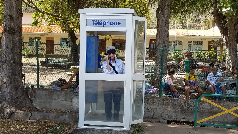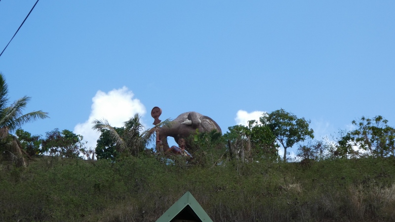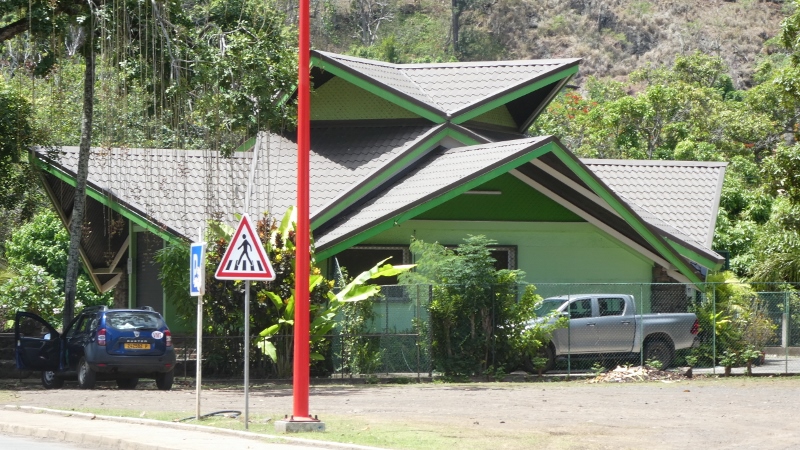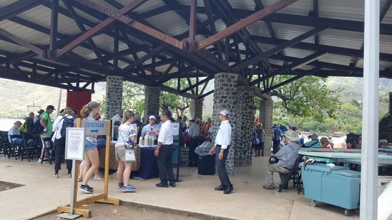 On Wednesday morning, we awoke to find ourselves anchored in Taiohae Bay. It was a “kinda” sunny day with this lovely sun-shower taking place right in front of us!!!A rainbow had formed but we failed to capture it on film. Our first failure of the day.But at least, we did capture the beauty of the island!!!The MS Zuiderdam remained in the bay as tenders transported us all to the island.A platform was positioned to assist us in boarding the tenders.We watched as our lifeboat was lowered to operate as a tender.We lost count of how many tenders were put into operation. But there are 1400 passengers on board!!!The first tender was sent ahead to set up for our landing.By the time we set foot on the island, the vendors will be set up and redy to supply us with wooden carvings, black pearls, woven baskets, and a llittle food and drink!!!Before heading out to enjoy the day, we paused in the Crows Nest for capuccino and the last of Betsy’s famous biscotti!!!And then off we go to start the adventure on shore. We are headed for Rose Corser’s Hee Tai Inn & Museum founded by Rose and her late husband. They had originally visited in 1972. And then moved to Nuku Hiva permanently in 1979.Once ashore, we were greeted with music and dancing.Souvenirs, food and drink were readily available.Carvings such as this above the docking area (where the old fort once was) are common all over the island!!!This building is a craft center and filled with wooden carvings and jewelry.A nice little nook for a pleasant libation!!!This is the local jail. There are 4 cells. The prisoners are free to roam and will come out to talk to the tourists. We were told there are rules; and, if broken, the prisoners are sent off to another island for more stringent resriction!!!At this point, we set off on the 1.4 mile walk to the museum. Our second mistake of the day.Along the walk, we had to stop for a photo of the local bank. The design reminds us of the Frank Geary Biomuseo in Panama!!!As we moved along, we came to a cemetery. We wound up walking thru hoping to find the Herman Melville Memorial that was installed in Taiohae sometime in the 1990s. Not there. That was our 3rd failure of the day.Continuing along, we came across a nice view of the MS Zuiderdam anchored in the bay. Decided not to crop this photo because the longboats are interesting. The tires, not so much.Passing the Taiohae Cathedral, we chose to continue without stopping as we had been here before.