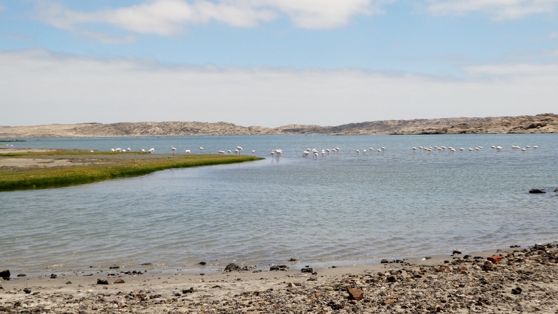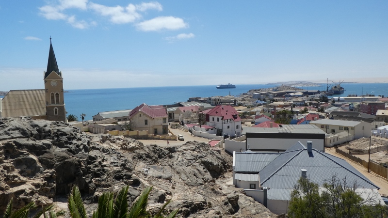 Seal Island is just off the point, and yes, look closely, you’ll see the seals atop the rock.Heading back to town, we passed the Black Cut, where a long ago volcanic eruption left its mark.And, of course, we passed more sand because here in Namibia the desert, quite literally, meets the sea!!!That’s our ship anchored out at sea!!! We won’t board for a while as we are now on our way to town for more exploration and then lunch!!!We pass flamingos along the way. They are not quite pink, but the bottom of their wings are a bright coral; visible only when they flap their wings!!!Once back in town, we see the City’s famous German architecture. This is Goerke Haus.From an upper floor of the Goerke Haus, we took this photo overlooking the town, with the Felsenkirche on the left.