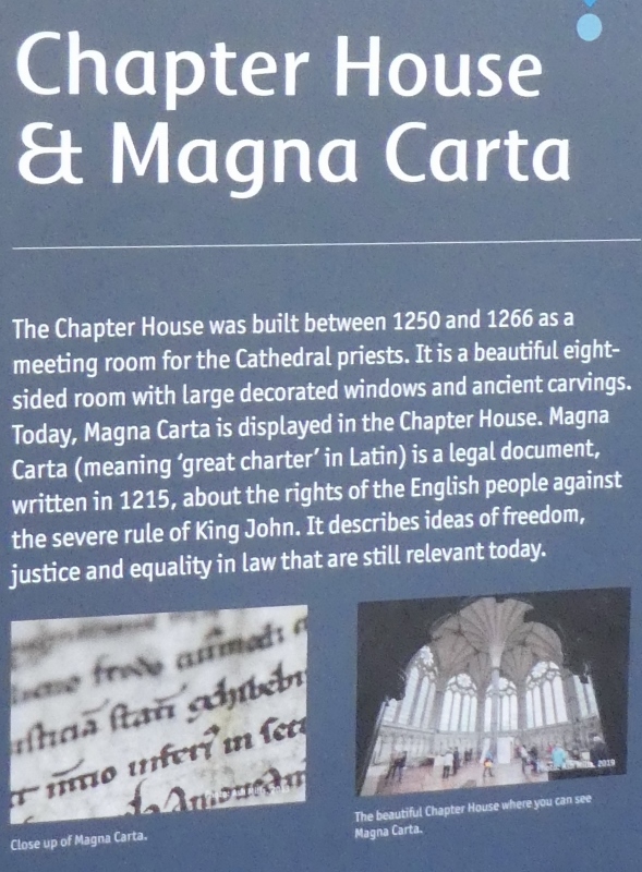 The Cathedral is home to the best of 4 surviving copies of the Magna Carta. Elias Dereham, who was a canon of Salisbury and later supervised the Cathedral’s construction, had been a participant at Runnymede in 1215 when the King signed the Magna Carta. He was one of the canons tasked with distributing some of the original Magna Carta copies. The Chapter House was constructed as a serene place for key Cathedral staff to meet. It now houses the Magna Carta in a dignified and easily navigable line through an enclosure that protects the copy form light or touch. But what, exactly, is the Magna Carta?Well, in the eyes of the Church and a group of rebellious barons, King John ruled as a tyrant. Having forced the king to the negotiating table at Runnymede, he agreed to the baron’s demands. On June 15, 1215, the Magna Carta was signed into law assuring the rights of the English people against the severe rule of King John. The Magna Carta forms the foundation of “rule of law” and is is used as a basis in the constitutions of many countries!!! This is one powerful document!!!