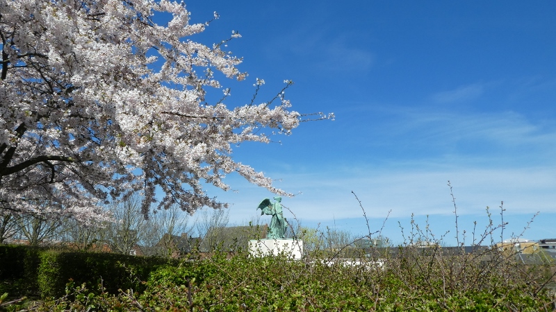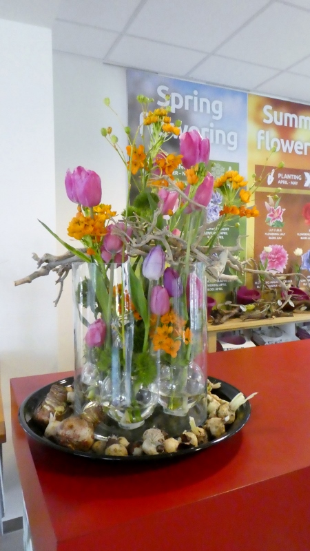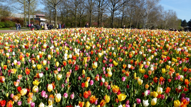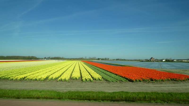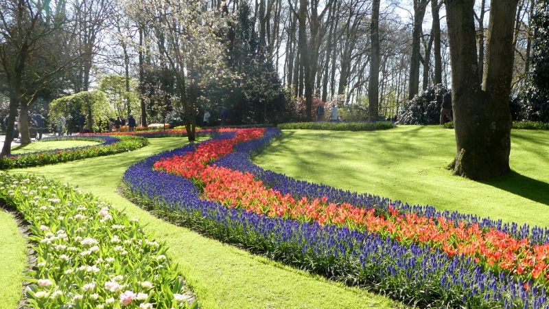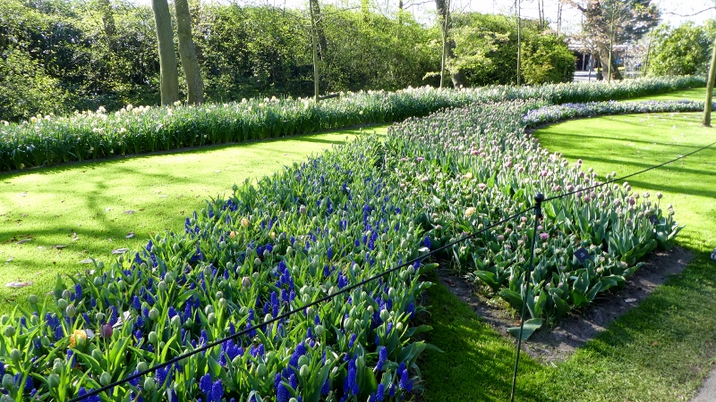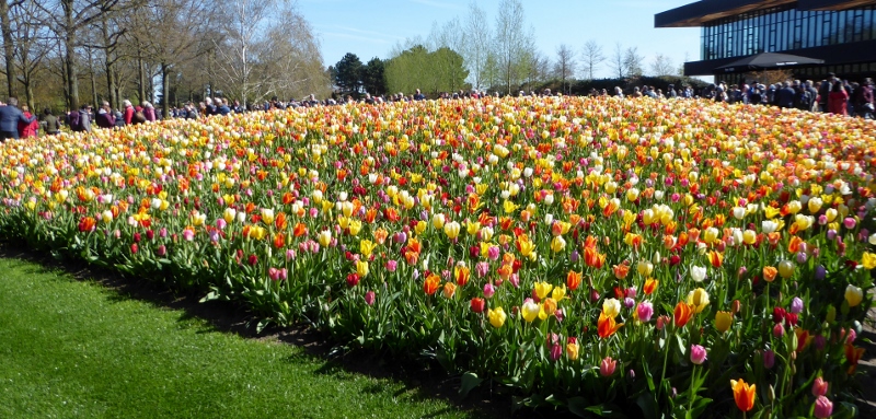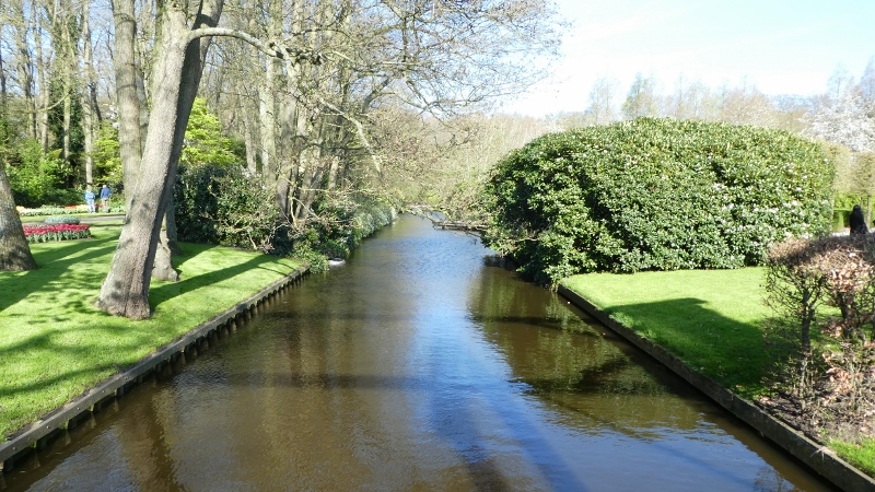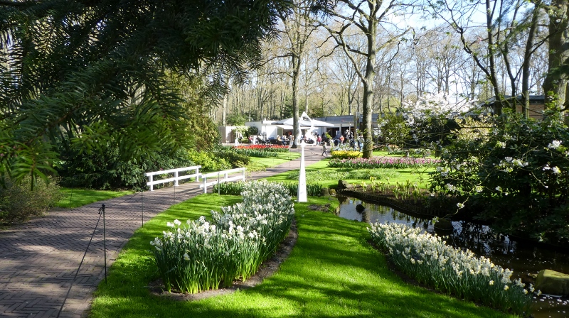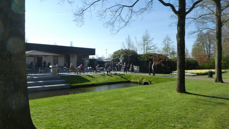 The following morning, we motored over to the Keukenhof Gardens. We passed acres and acres of growing fields like this along the way.And then we arrived at Keukenhof and were wowed by the riot of color across the landscape.Absolutely gorgeous!!!Touring the gardens will take as long as you want. There is so much to see. Many different varieties of plants; waterscapes, statuary, and even gift shops scattered around the complex.Canals…..…..different varieties of blooms…..…..and this little corner has it all–statuary, water feature, assorted flowers, gift shop, and even snacks!!!