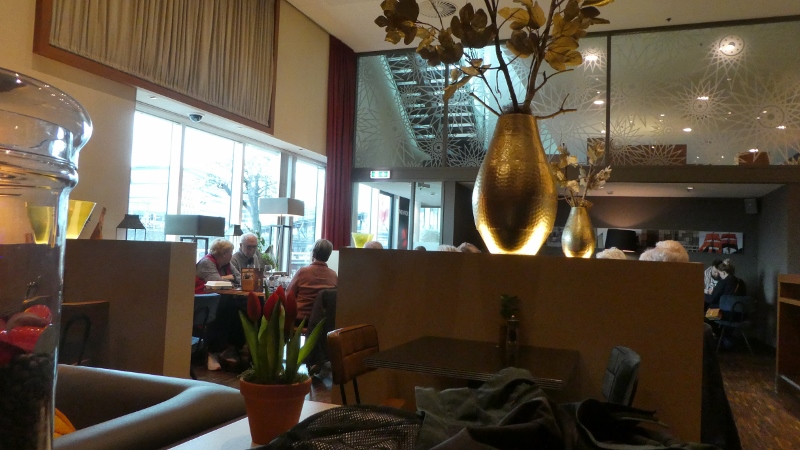 Here we are; docking in Amsterdam.Amsterdam has a large and friendly passenger terminal. When we departed the ship later in the day for a little exploration, we found a pop up market set up in the terminal. You betcha, we shopped!!!We found our way to the near-by Movenpick Hotel where we stopped-in to warm-up and enjoy our usual afternoon French Fries and beer!!!The Movenpick’s atmosphere was warm and inviting.