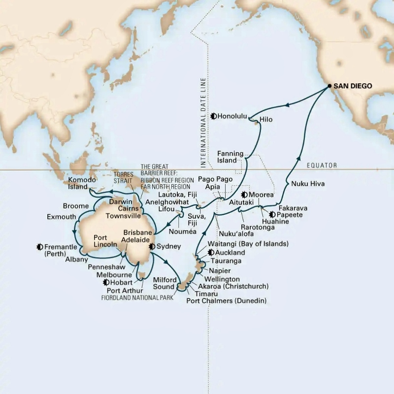 The New Year is rapidly approaching. The time has come for another exciting cruise. And this one is very different from the World Cruises we have enjoyed over the past years. This time, we are sailing out of San Diego, a charming and interesting city. Many of our family members have lived in the San Diego area over the past decades; and for that reason, we are very comfortable with Imperial Beach, Chula Vista, The Hotel Del Coronado, Old Town, the ZOO!!! We ALWAYS look forward to visiting San Diego!!! On this journey, we will see San Diego TWICE!!! First for the departure on January 3, 2024. And then, once again, on April 6, 2024, when the MS Volendam transforms from the Australia/New Zealand Grand Cruise into the SAN-FLL, 15-day transit of the Panama Canal.