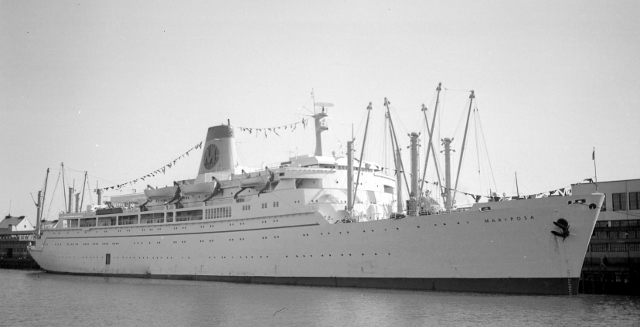 The SS Mariposa II, built as a cargo carrier in 1952; sold to Matson in 1956, operating as a “White Ship” till 1971 when sold to Pacific Far East Lines; sold to cargo carrier in 1979; scrapped 1996. (Photo by Walter E. Frost City of Vancouver archives.)