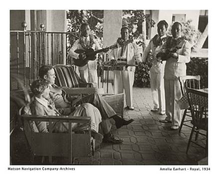 Previous Image Next Image 6-625×503-1 Amelia Earhart and her husband George Putnam relax on a veranda at the Royal Hawaiian while listening to island musicians. (Matson Navigation Co. Archives.Pacific Aviation Museum – Amelia Earhart_Royal_1934. CC BY 2.0)