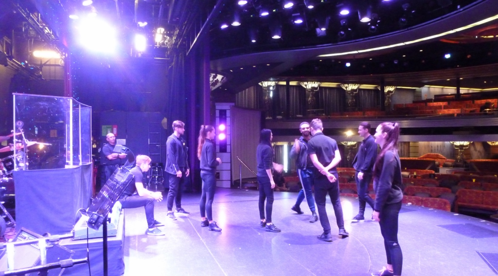 Previous Image Next Image Milling about the stage with the cast and crew during a backstage tour. Milling about the stage with the cast and crew during a backstage tour.
